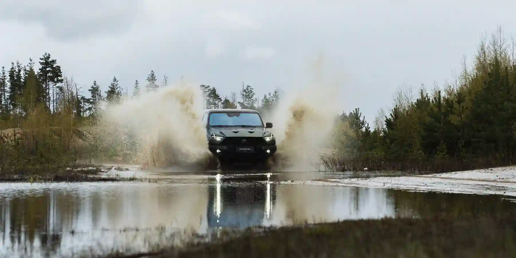 M‑HERO показал себя просто по-геройски. Во-первых, он был ангельски тих: электромоторы не давали о себе знать ни шумом, ни вибрацией, а ДВС ни разу не вступил в дело. Но главное, мне очень понравилось, как «Воин» едет: подвеска скрадывает все дорожные неприятности, позволяя почти не замечать «лежачих полицейских», и при этом машина прекрасно держит траекторию в поворотах. На высоких скоростях она волшебным (точнее, пневматическим) образом припадает к земле на 45 мм, в результате высокий рамный вездеход весом в три с лишним тонны проходит виражи лучше, точнее и с меньшими кренами, чем большинство городских китайских «паркетников». Особенное удовольствие доставила езда по проселкам. Никакие ямы, кочки, рытвины, гребенка «М-Герою» не страшны, он проходит их на ура — главное, чтобы ваш пассажир не пугался и покрепче держался за массивный поручень на передней стойке. Такой замечательный характер обусловлен конструкцией подвески. Независимая, на параллельных треугольных рычагах не только спереди, но и сзади, где у прочих рамных вседорожников находится неразрезной мост, она обеспечивает недостижимую для конкурентов управляемость. И, разумеется, замечательную проходимость. Кроме привода на все колеса, понижающего ряда передач, могучего крутящего момента в 1050 Нм, большого хода подвески и блокировок межколесных дифференциалов на вооружении M‑HERO — пневмосистема, с помощью которой можно увеличивать клиренс со стандартных 221 до 326 мм. Глубина брода при этом достигает 900 мм, а углы въезда и съезда увеличиваются с 31 до 36,8° и 37,5° соответственно. Мало того, задние колеса машины сделаны управляемыми. На скоростях до 20 км/ч «М-Герой» поворачивает их на 10,6 градуса в сторону, противоположную передним, облегчая водителю развороты. Но можно принудительно поворачивать их вместе с передними — такая «крабья походка» еще больше увеличивает маневренность машины и ее возможности вне асфальта.