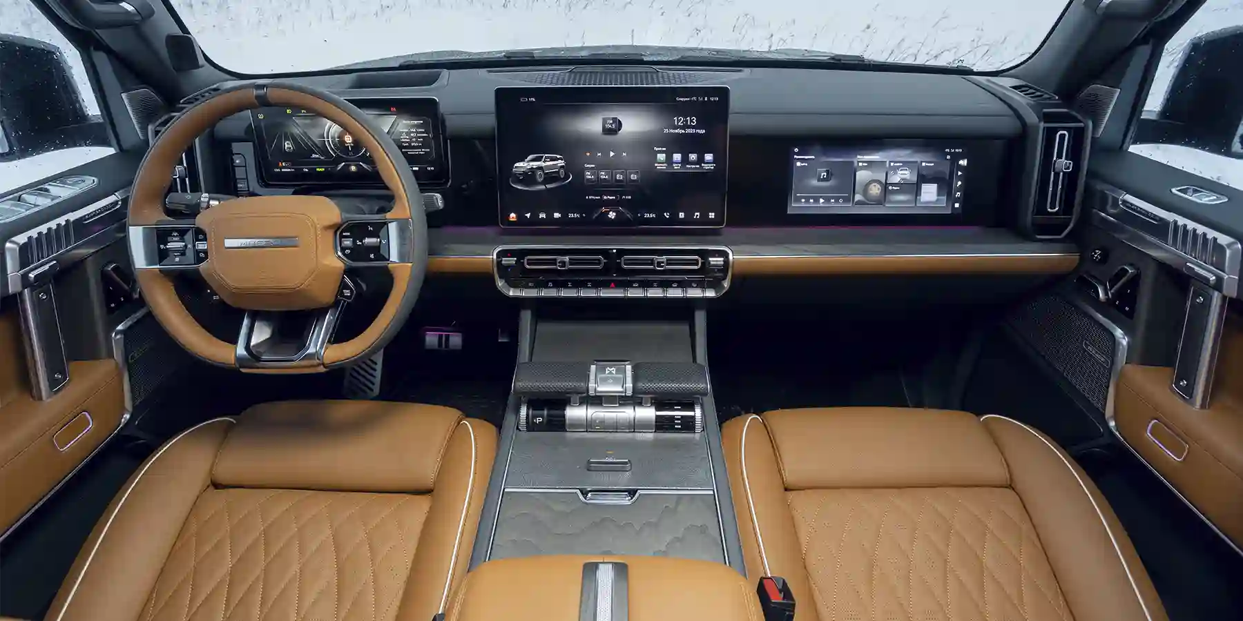 Внешне он действительно крут. Команде дизайнеров корпорации Dongfeng, которой принадлежит марка M‑HERO (на родине его называют «Менши», то есть «Воин» или «Уорриор» по-английски), удалось создать автомобиль одновременно воистину огромный, максимально брутальный, предельно агрессивный и в определенном смысле даже изящный. Весь секрет — в пропорциях: «М-Герой» на 397 мм длиннее и на 149 мм шире «Гелендвагена» от Mercedes Benz, но на 35 мм ниже. А потому кажется, особенно на фото, не таким уж и большим. И только когда видишь его воочию, впервые пытаешься взобраться на капитанский мостик этого корабля пустыни, понимаешь, насколько M‑HERO 917 грандиозен.
